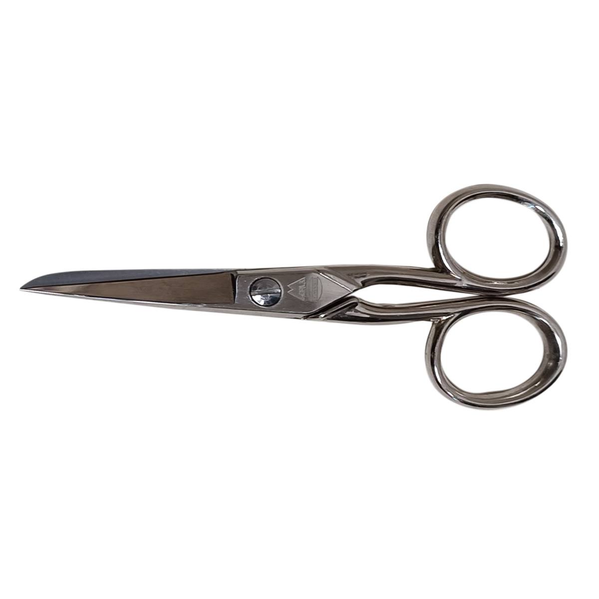 Kovinske škarje velikosti 4.5" (110mm), ravne, ena konica zaobljena, druga konica špičasta.