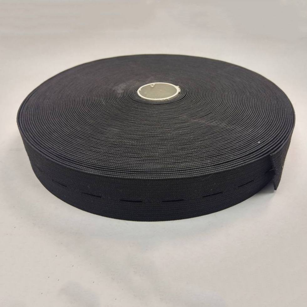 Elastika z luknjicami, črne barve, širine 30 mm. Cena je za kolut, na katerem je 25 m elastike.